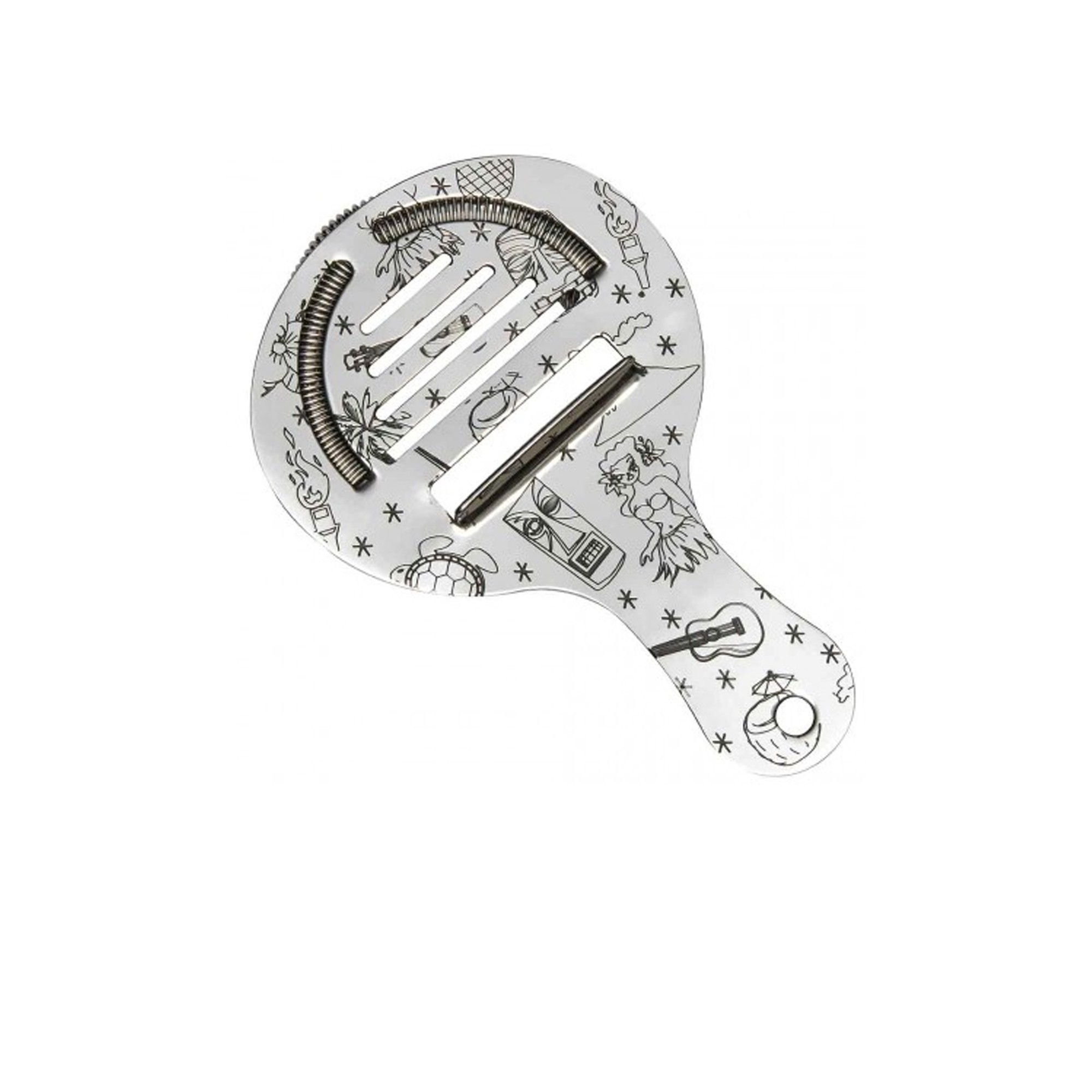 Εντυπωσιακό Cocktail Strainer σχεδιασμένο να μπαίνει μέσα στο shaker, κατασκευασμένο από υψηλής ποιότητας 18/8 Ιαπωνικό ατσάλι, με εργονομική λαβή και πυκνό σπιράλ για καλύτερο φιλτράρισμα. Είναι διακοσμημένο με Χαβανέζικα σχέδια, εμπνευσμένα από την Tiki κουλτούρα, χαραγμένα με μελάνι ασφαλές για τρόφιμα. Ιδανικό για να συμπληρώσετε τη μοναδική Tiki συλλογή σας.