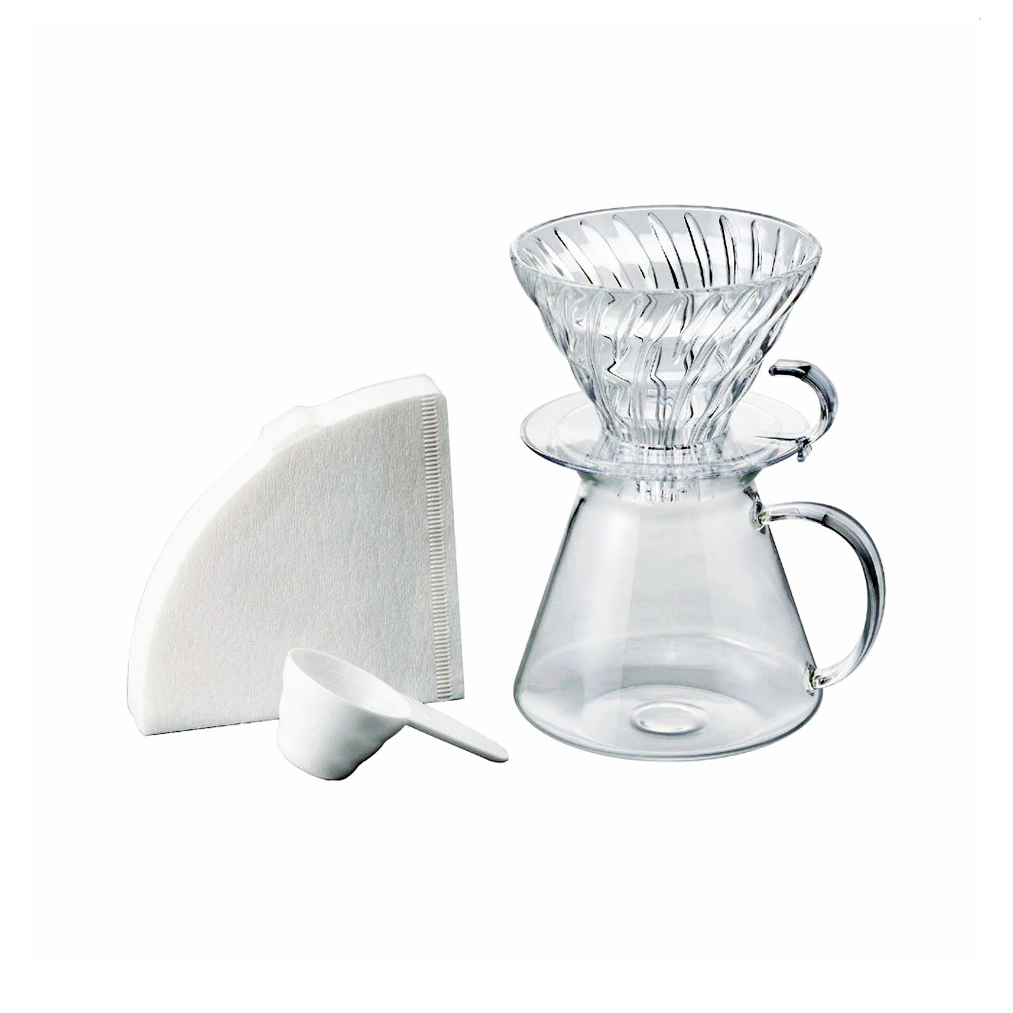 Το V60 είναι το κορυφαίο Dripper της HARIO.Το φίλτρο κωνικού χαρτιού σε σχήμα V επιτρέπει να τοποθετήσετε ένα βαθύ στρώμα αλεσμένου καφέ και εξασφαλίζει την ομαλή ροή ζεστού νερού στην κορυφή του κώνου για να εξαγάγετε πλήρως τη γεύση του καφέ που επιθυμείτε. Αυτό το σετ περιλαμβάνει το απόλυτα διαυγές γυαλί V60 και την κανάτα.