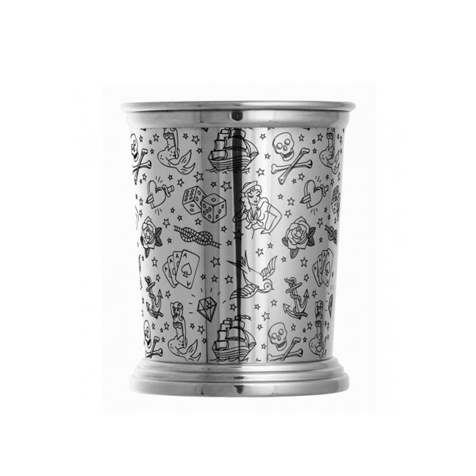 Ποτήρι julep, χωρητικότητας 410ml, κατασκευασμένο από υψηλής ποιότητας 18/8 Ιαπωνικό ανοξείδωτο ατσάλι. Είναι διακοσμημένο με Old School Tattoo σχέδια, χαραγμένα με ειδικό μελάνι, ασφαλές για τρόφιμα. Η Vintage αισθητική του και η πρωτότυπή του εμφάνιση το καθιστούν το ιδανικό ποτήρι για να σερβίρετε julep mints και άλλα τροπικά cocktails.