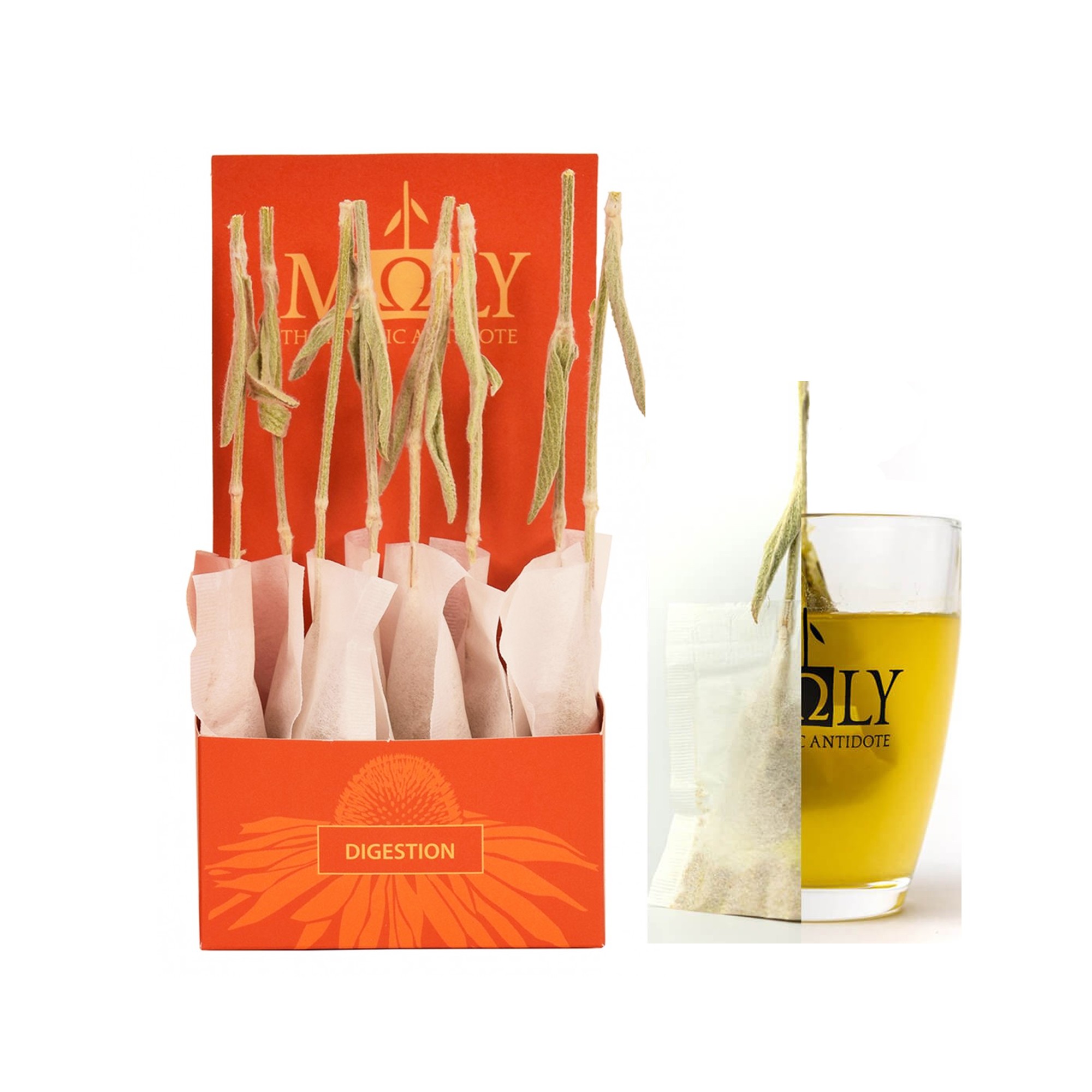 MΩLY Digestion (τσάι του βουνού, δίκταμο, χαμομήλι, μαραθόσπορος, σχισάνδρα, χαρούπι, γλυκόριζα, τζίντζερ): βότανα γνωστά για την παραδοσιακή τους ευεργετική δράση στο γαστρεντερολογικό σύστημα.