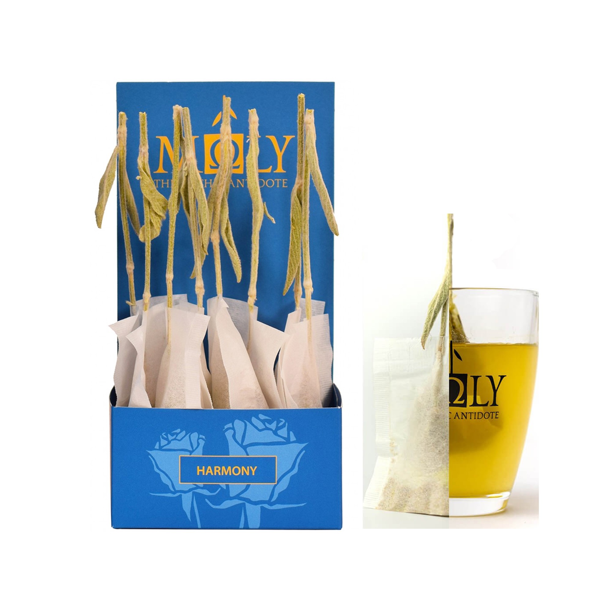 MΩLY Harmony (τσάι του βουνού, μελλισόχορτο, σκουτελάρια, τριαντάφυλλο Δαμασκού, γλυκόριζα, γουιθάνια): συνδυασμός ευωδιαστών βοτάνων για τη χαλάρωση του οργανισμού και την ανακούφιση από την πίεση του σύγχρονου τρόπου ζωής.
