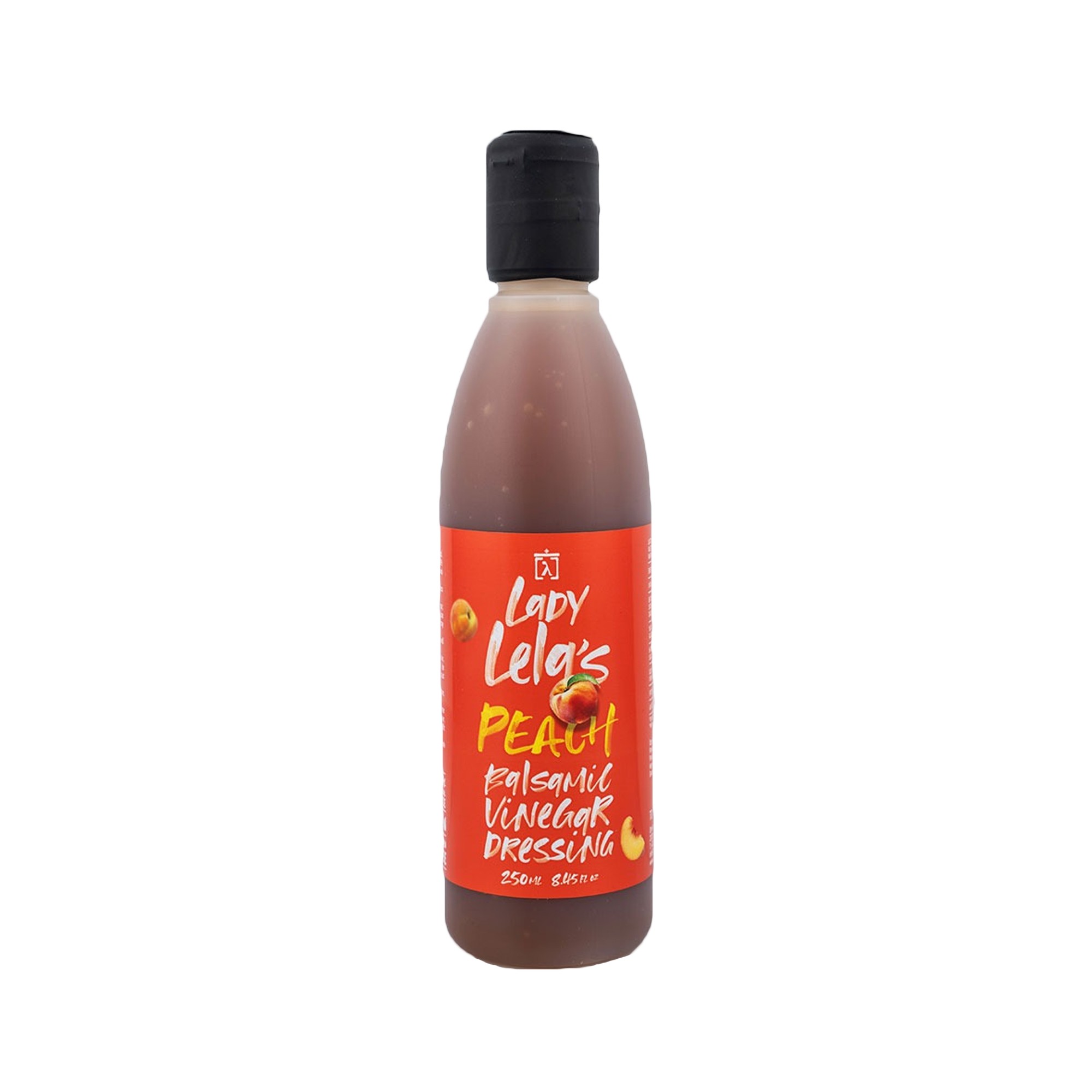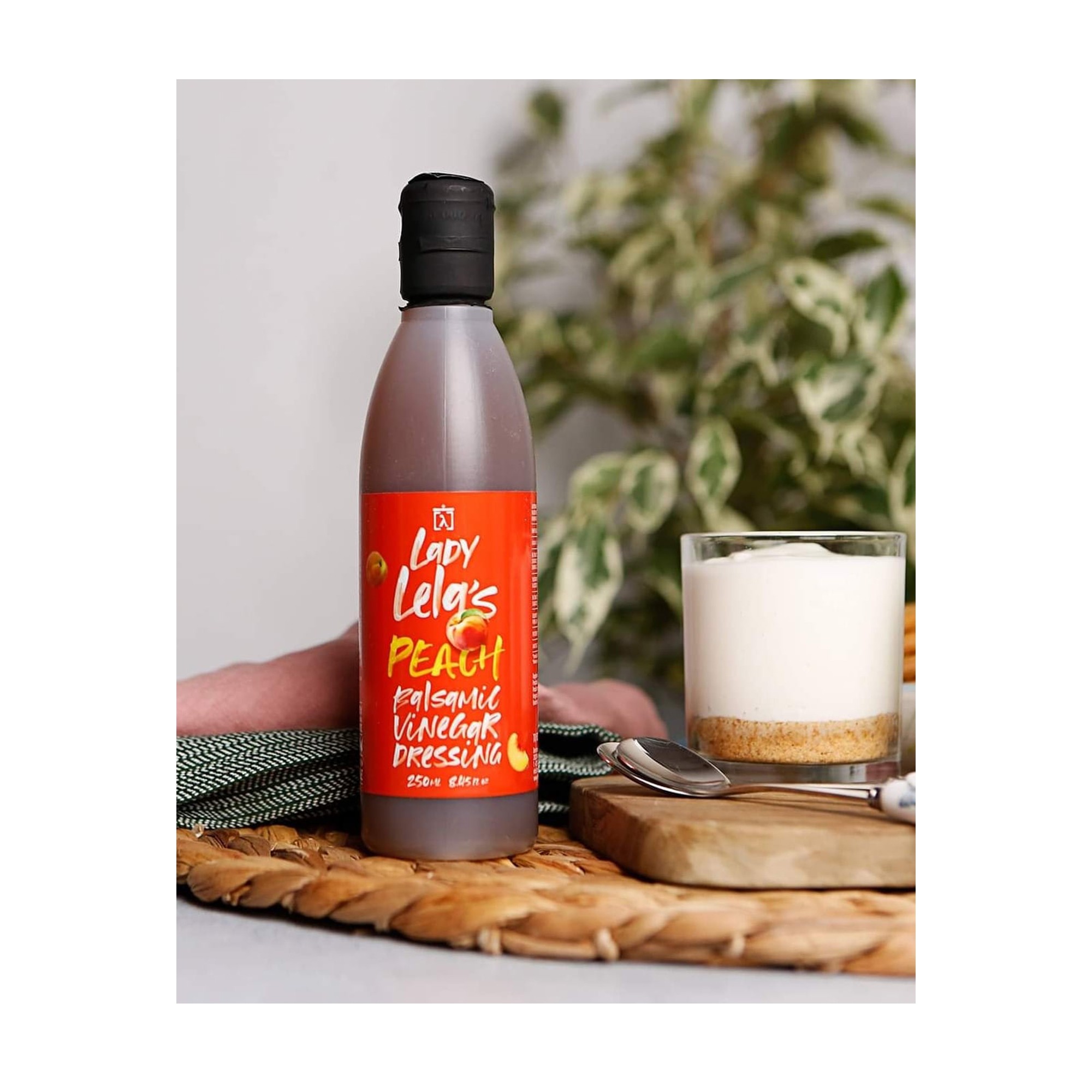 Λευκό Βαλσάμικο ξύδι (λευκό ξύδι από κρασί 33%, συμπυκνωμένος μούστος σταφυλιών), ξύδι ροδάκινου, 28% φυσικός χυμός ροδάκινο, ζάχαρη, τροποποιημένο άμυλο, φυσικό άρωμα ροδάκινου. Μπορεί να περιέχει θειώδη.